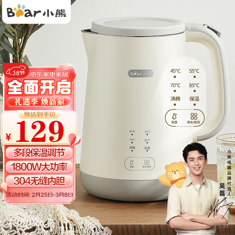 小熊(Bear)烧水壶 1.7L电热水壶智能触控 5段调温恒温水壶侧显温度电水壶热水壶 无缝内胆易清洁 ZDH-C17F2价格:129.00元!