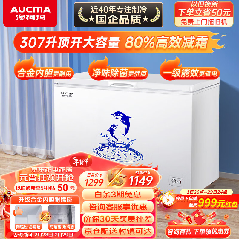 澳柯玛(AUCMA)307升低霜冰柜家用商用大容量冷藏柜冷冻柜转换 卧式冷柜冰箱雪糕柜一级能效以旧换新BC/BD-307HNE价格:1149.00元!