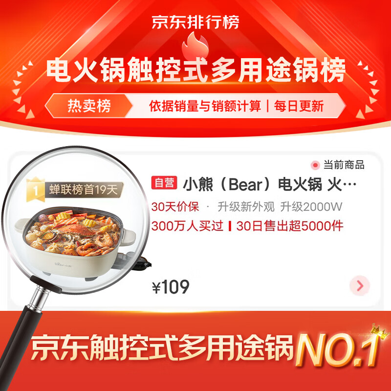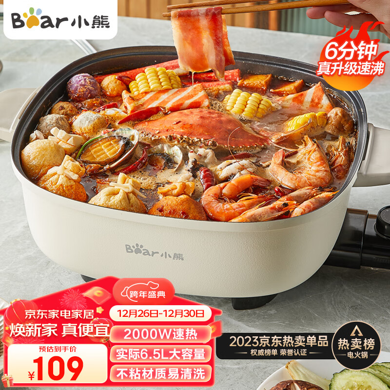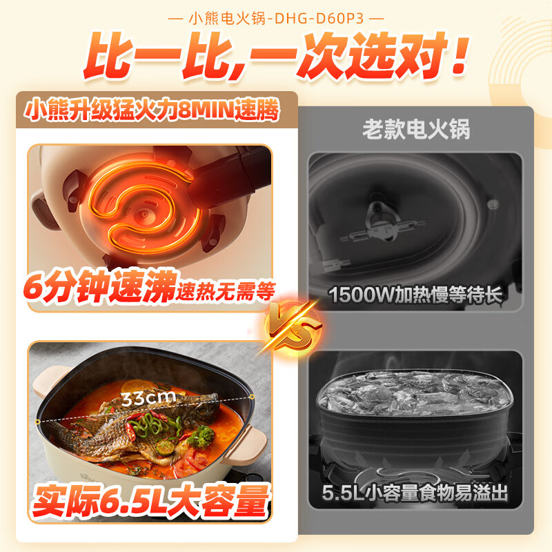小熊(Bear)火锅专用锅 电火锅 6分钟速沸 家用电锅一体多功能电煮锅涮肉火锅锅具 DHG-D60P3 6.5L大容量价格:99.00元!