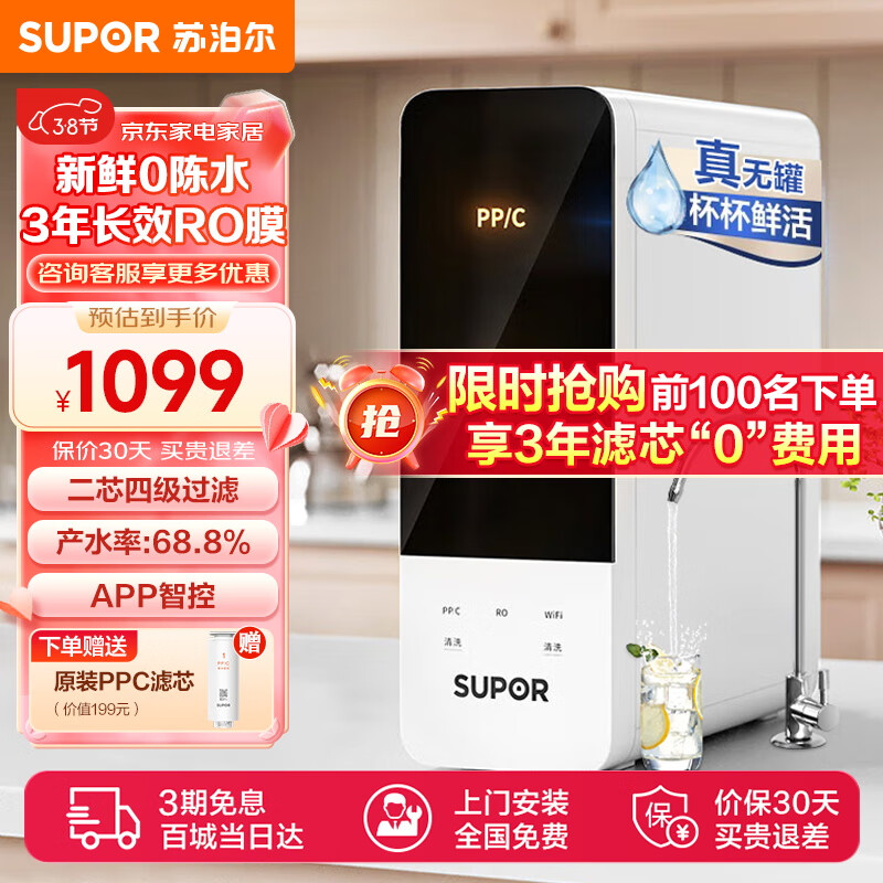 苏泊尔(SUPOR)净水器家用直饮机RO反渗透纯水机400G大通量过滤器DR2H1滤水器台下软水机厨下厨房净水机价格:1098.00元!