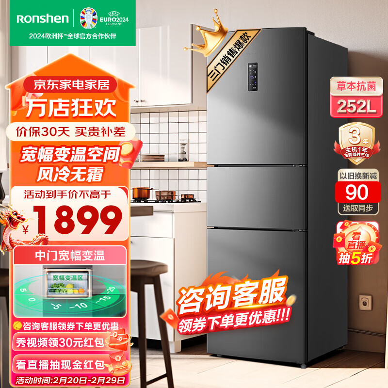 容声(Ronshen)252升三开门多门电冰箱变频一级能效节能家用风冷无霜租房冰箱 BCD-252WD18NP价格:2099.00元!