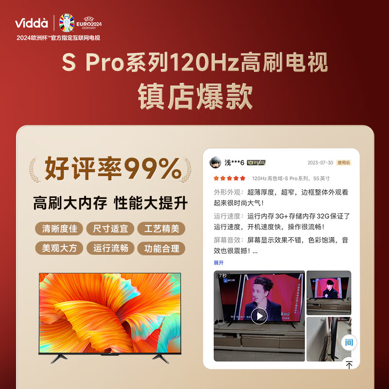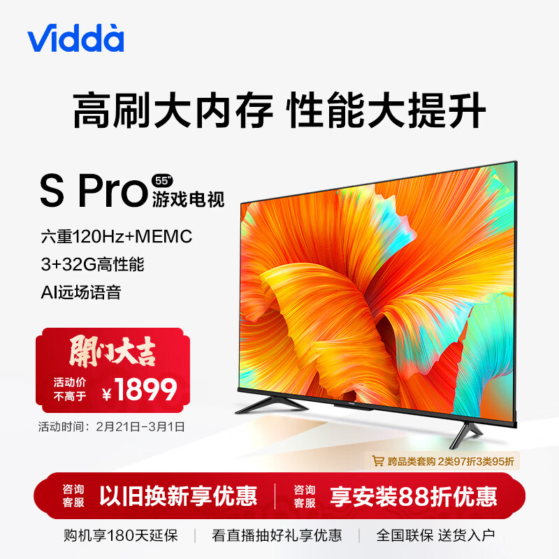 Vidda S55 Pro 海信 55英寸 120Hz高刷 4K超薄屏 3+32G MEMC防抖 智能液晶巨幕电视以旧换新55V1K-S价格:1899.00元!