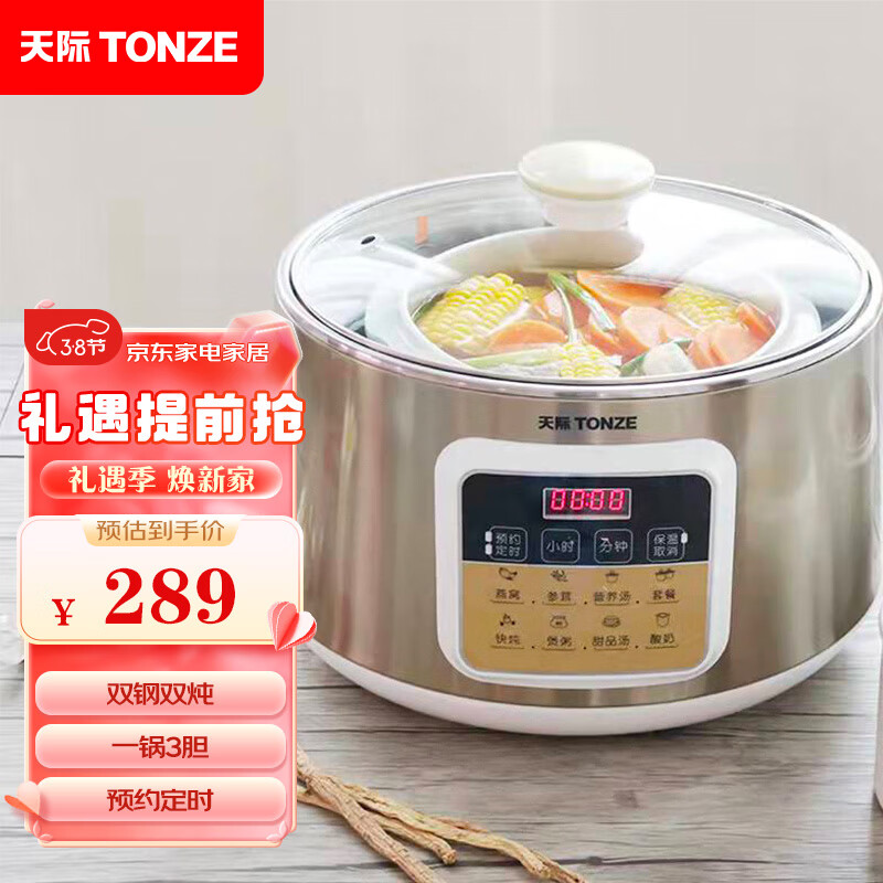 天际(TONZE)电炖锅 电炖盅 隔水炖锅 煲汤锅炖汤锅 熬粥燕窝养生 不锈钢锅体 白瓷3胆 DGD25-25CWG 2.5L价格:289.00元!