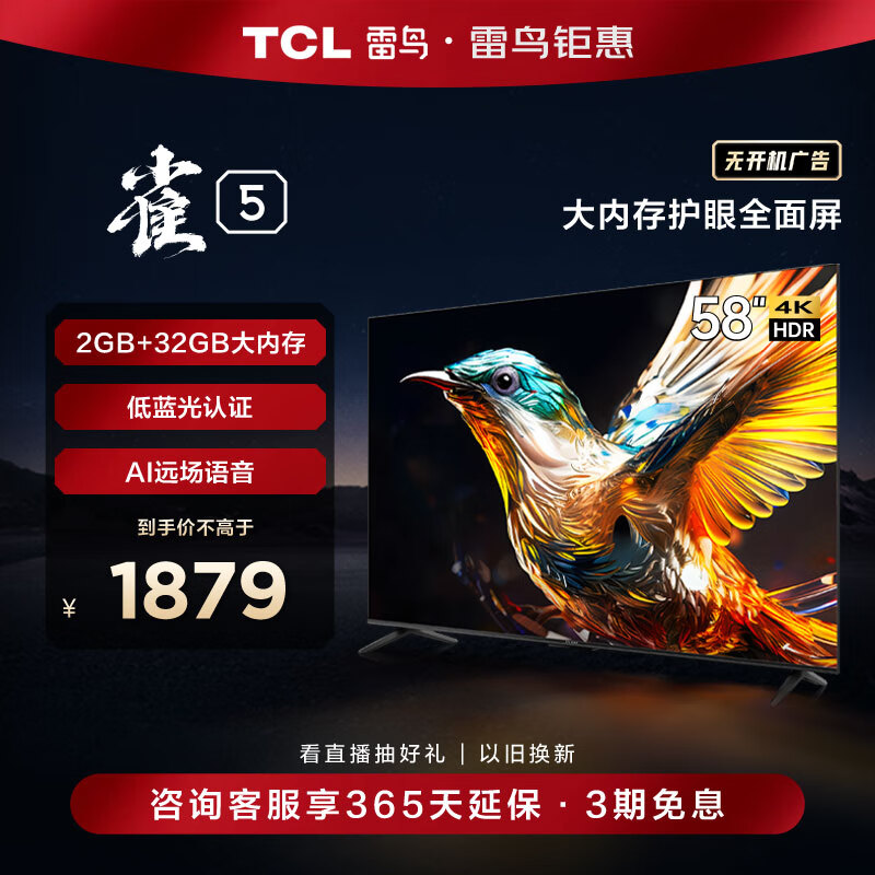 TCL雷鸟 雀5 58英寸电视 4K超高清 护眼防蓝光 超薄屏 2+32GB 游戏智能液晶平板电视机58F275C价格:1799.00元!