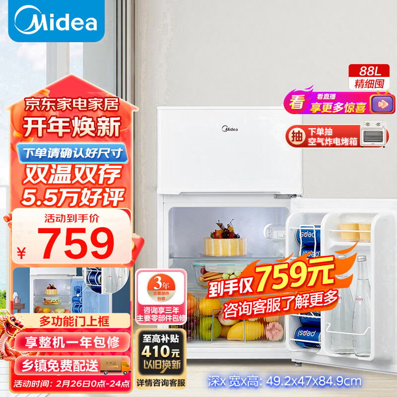 美的(Midea)88升迷你双开门小冰箱租房宿舍办公室小型家用双温可冷冻冷藏节能环保省电低耗低音BCD-88CM价格:759.00元!