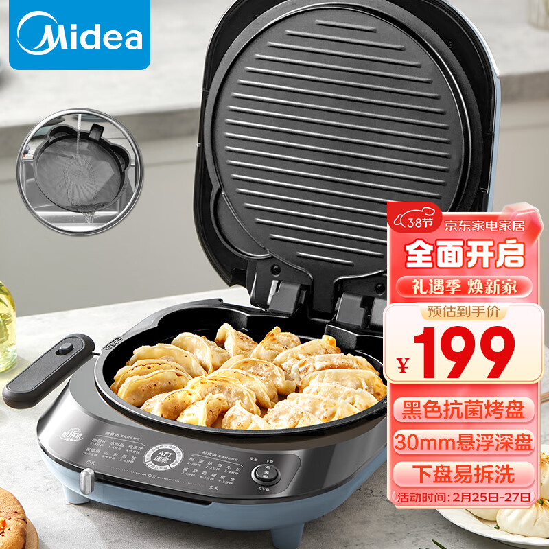 美的(Midea)电饼铛智能家庭用双面加热下盘可拆洗煎饼铛煎烤机烙饼锅早餐机加深烤盘大火力电饼档 JKE30J63价格:199.00元!