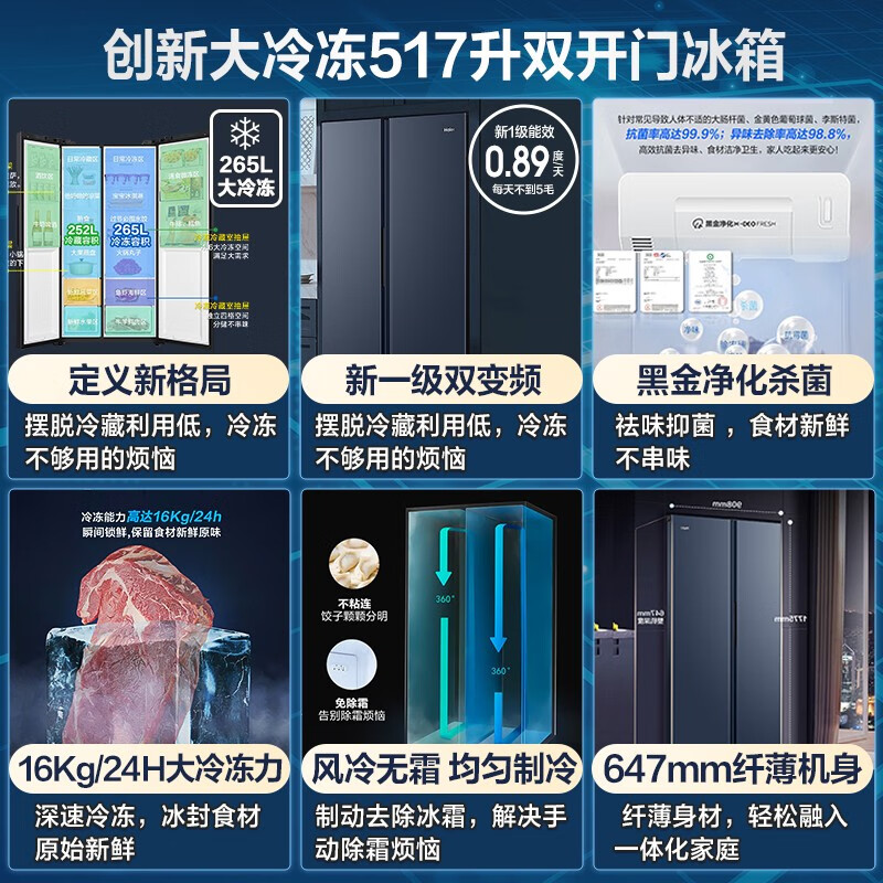 海尔(Haier)冰箱517升巨能冻风冷无霜双开门对开门新一级能效双变频大冷冻大容量净味超薄嵌入式家用电冰箱价格:3299.00元!