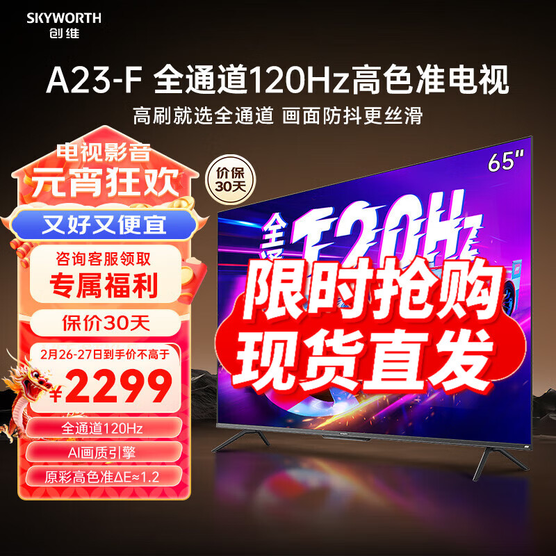 创维电视65A23-F 65英寸全通道120Hz高刷HDMI2.1 2+32G声控平板电视机以旧换新价格:2299.00元!