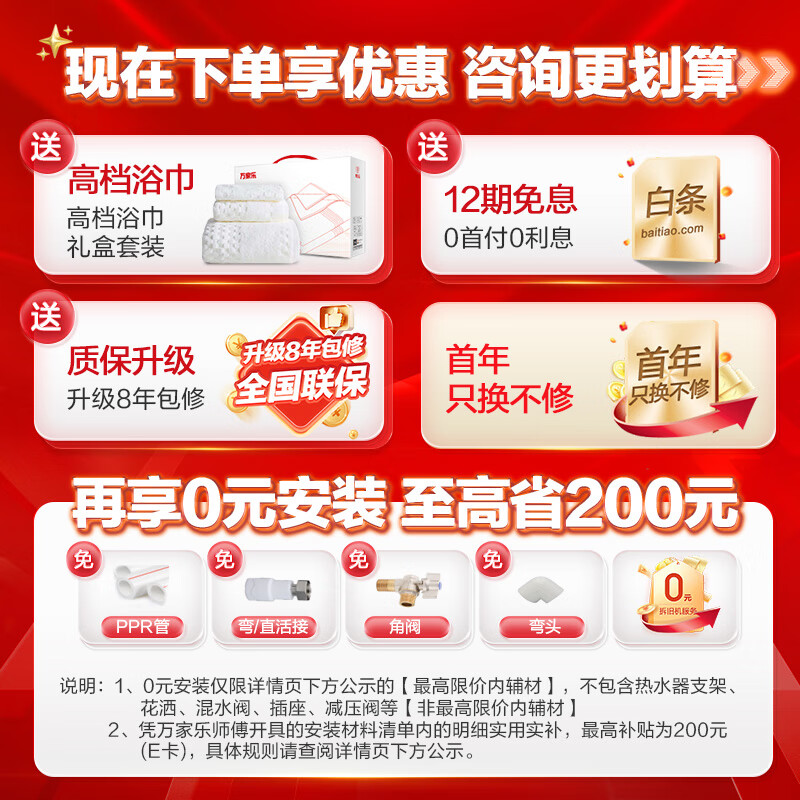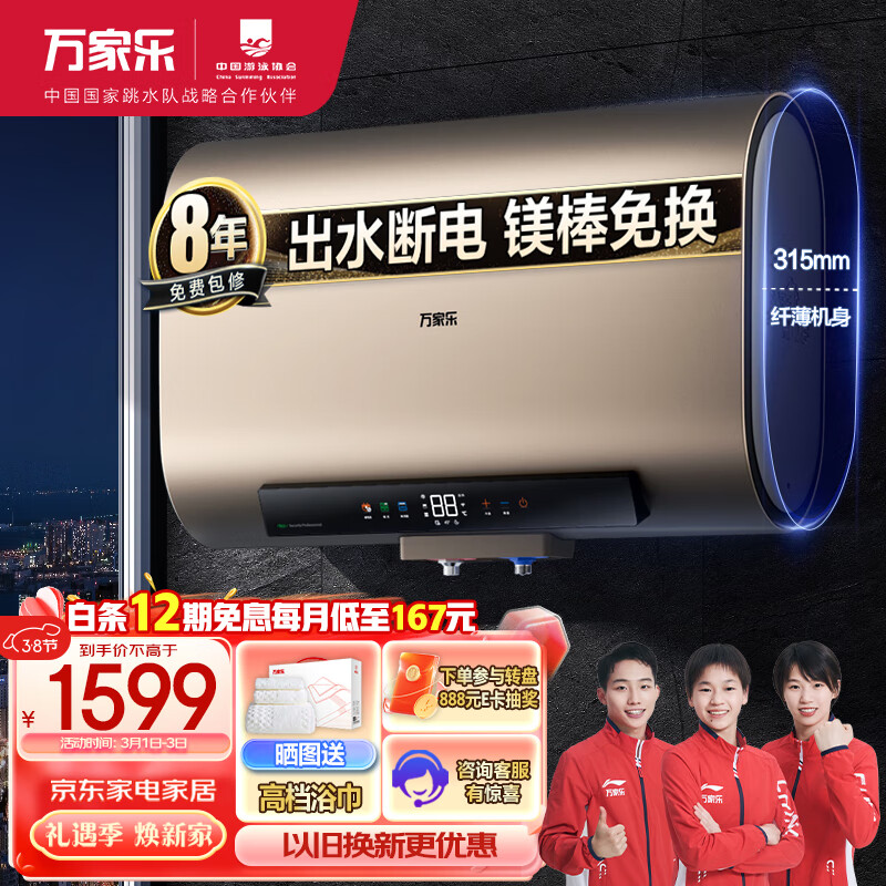 万家乐60升双胆扁桶电热水器3000W速热 镁棒免换 智能杀菌 出水断电 热水输出率高达90%一级能效D60-FB5价格:1799.00元!