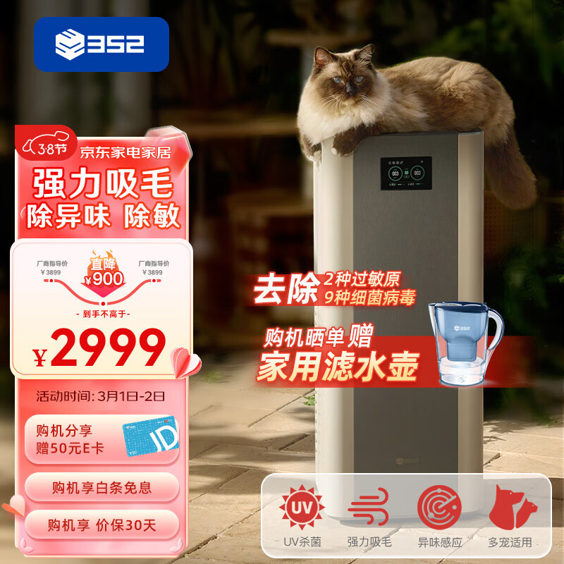 352空气净化器 宠物款猫毛净化器除菌吸毛除异味过敏原除尘螨甲醛 家用吸浮毛 X63 Pet 多宠适用价格:3199.00元!