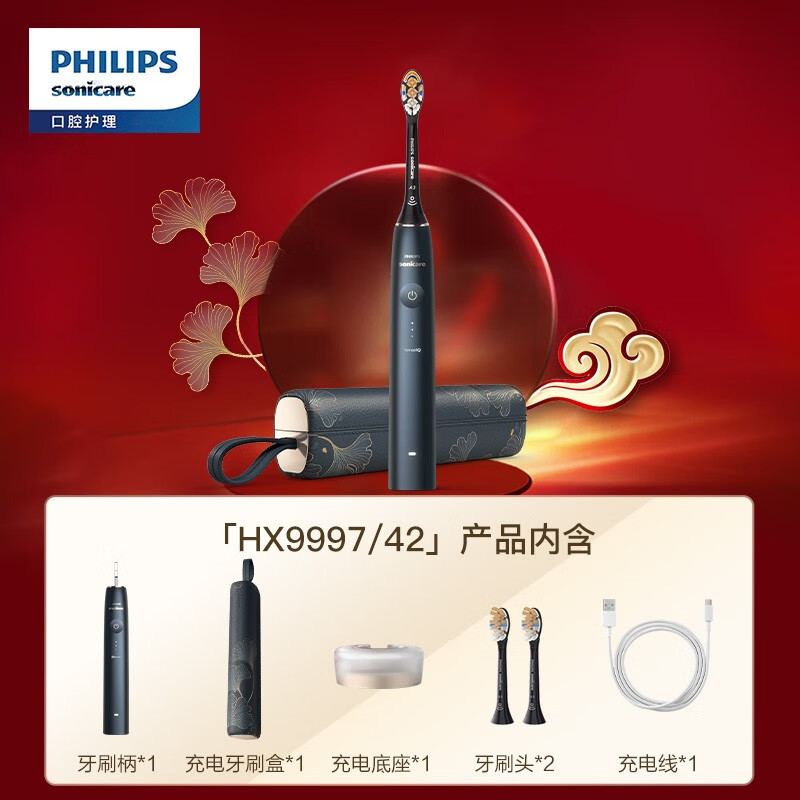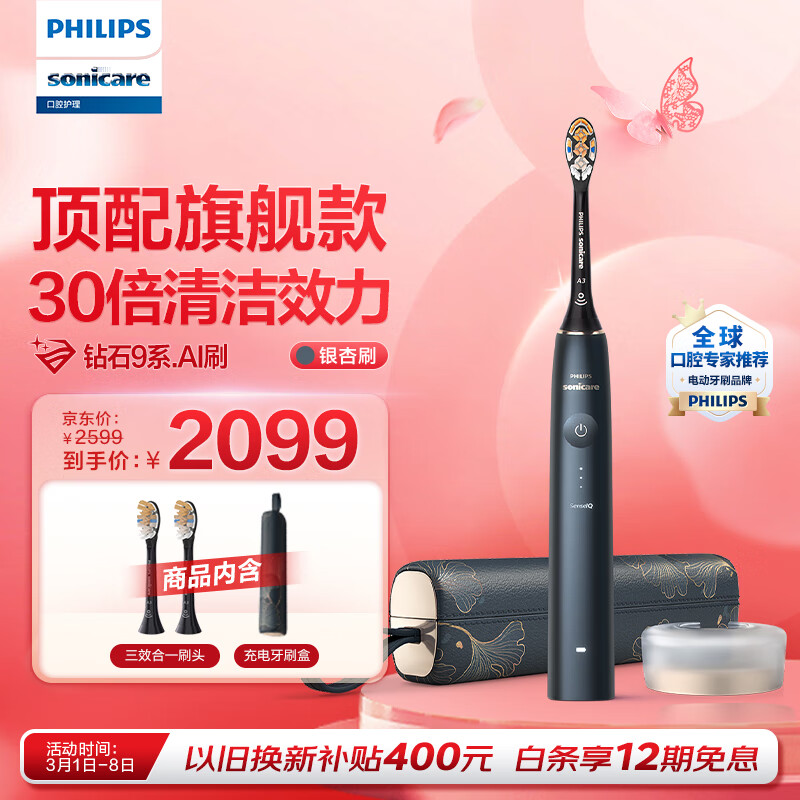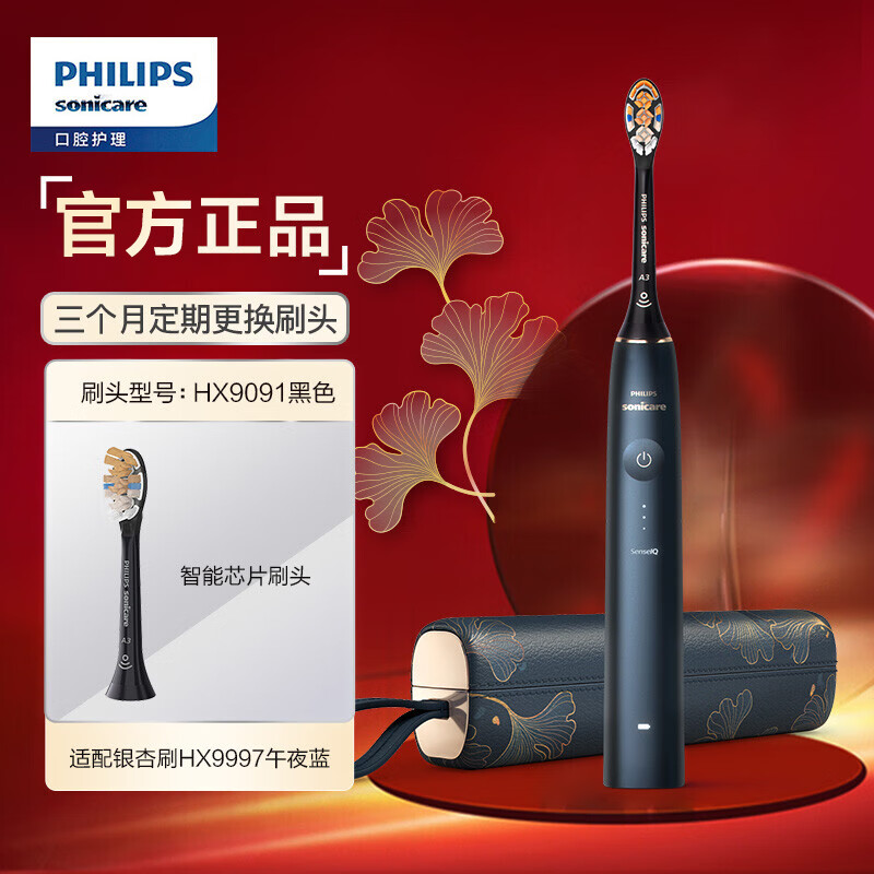 飞利浦(PHILIPS)电动牙刷情侣款 送女友/男友 新婚礼物 银杏款 20倍清除牙菌斑钻石9系AI刷午夜蓝价格:2379.00元!