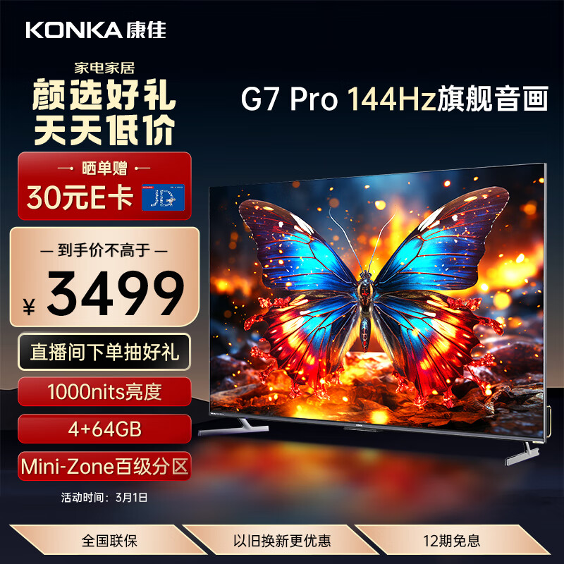 康佳电视 65G7 PRO 65英寸 百级分区 144Hz游戏电视 4+64GB 4K超清屏智能液晶平板电视机以旧换新价格:3499.00元!