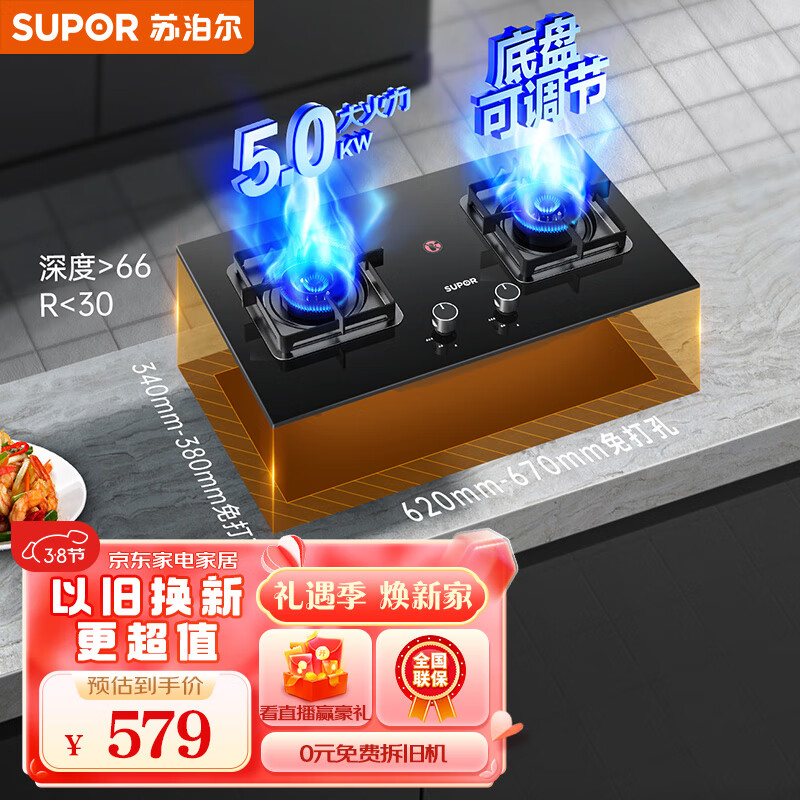 苏泊尔(SUPOR)燃气灶家用天然气灶 免改孔可调节支架灶具 台嵌两用双灶具 5.0kW大火力 DB29天价格:579.00元!