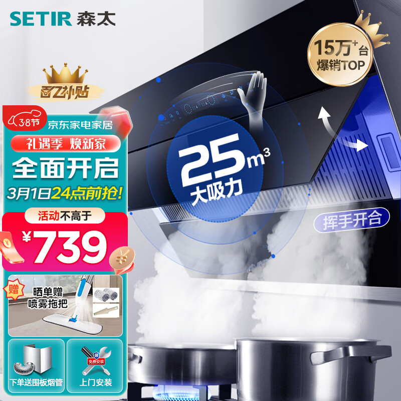 森太(SETIR)B560QC抽油烟机侧吸式脱排自动清洗吸油烟机大吸力家用抽烟机 高温自动清洗 25立方爆吸风量价格:739.00元!