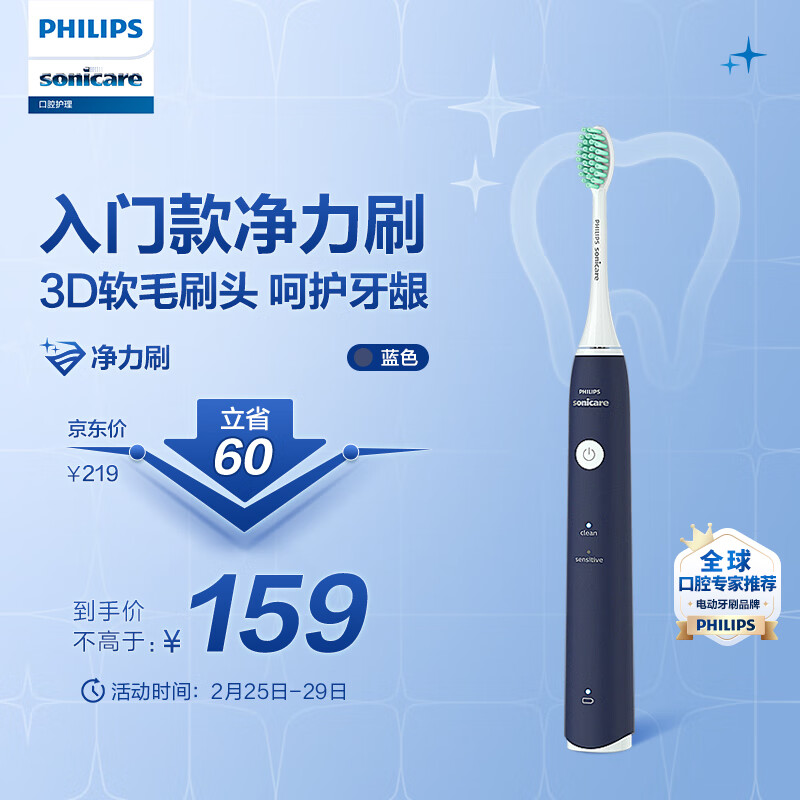 飞利浦(PHILIPS)电动牙刷成人情侣款 新年 情人节礼物送女友/男友入门款 2种模式 洁齿护龈净力刷深蓝色HX2431/06价格:167.00元!
