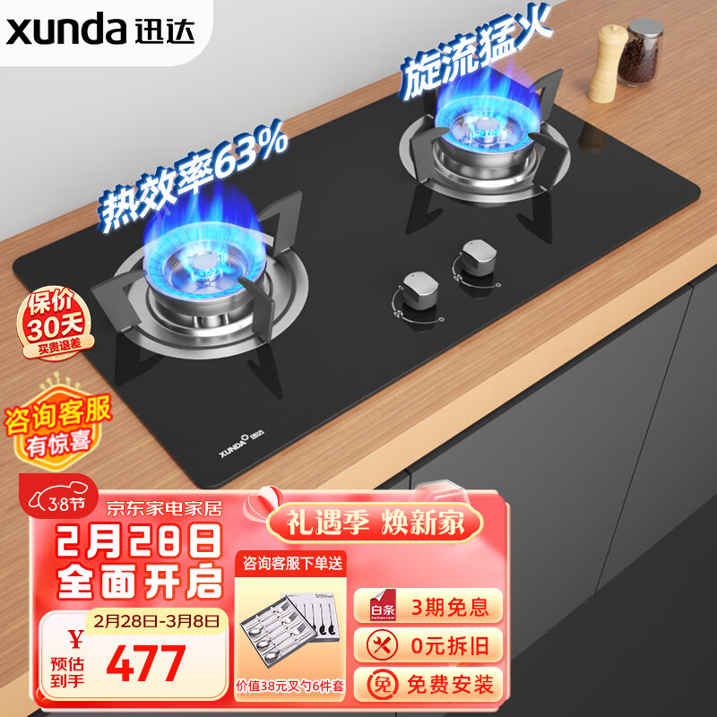 迅达(XUNDA)燃气灶液化气灶家用 煤气灶双灶具 嵌入式台式两用 4.1KW旋流猛火灶 钢化玻璃面板 Q1-液化气价格:527.00元!