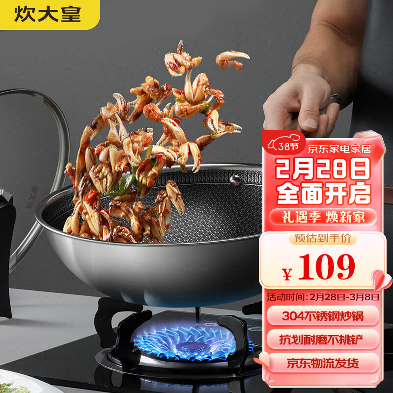 炊大皇 炒锅 304不锈钢炒菜锅煎锅 平底不粘炒锅32cm 可立可视盖不挑灶价格:139.00元!
