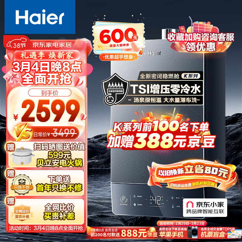 海尔(Haier)16升燃气热水器天然气 智能TSI增压零冷水 水伺服恒温 五段微火控温 一级静音JSQ31-16KT5FPRCU1价格:2599.00元!