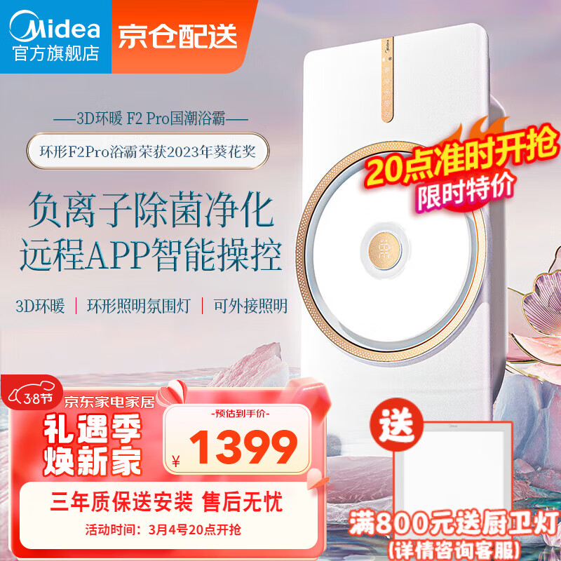 美的(Midea)风暖浴霸暖风照明排气一体集成吊顶卫生间吹风环形双核智能F2Pro价格:1399.00元!