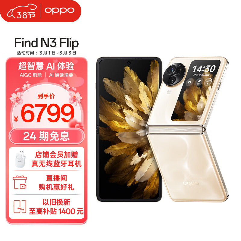OPPO Find N3 Flip 12GB+512GB 月光缪斯 超光影三摄 专业哈苏人像 120Hz屏 5G 拍照 AI 小折叠屏手机价格:6799.00元!