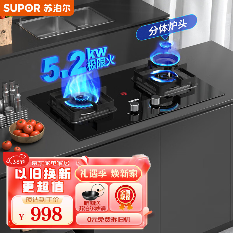 苏泊尔(SUPOR) 燃气灶双灶家用 天然气双灶具5.2kW极限火 黑晶面板 全进风 聚能环燃气灶具 DB70天价格:998.00元!