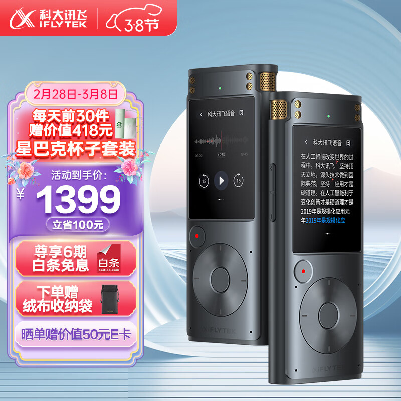 科大讯飞智能录音笔SR302星火版 32G内存 录音转文字 实时翻译转写免费转写价格:1399.00元!