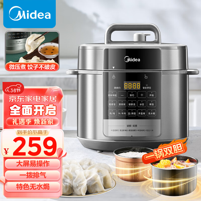 美的(Midea)饺子王系列 电锅5L家用全自动智能预约无水焗易清洁双胆大屏多功能高压锅MY-E5910(2-10人)价格:289.00元!