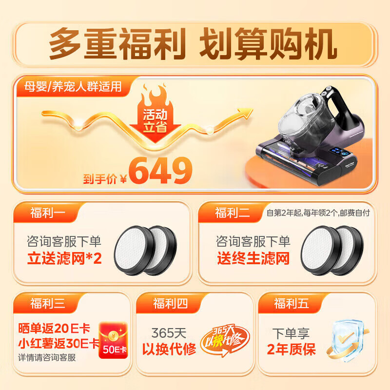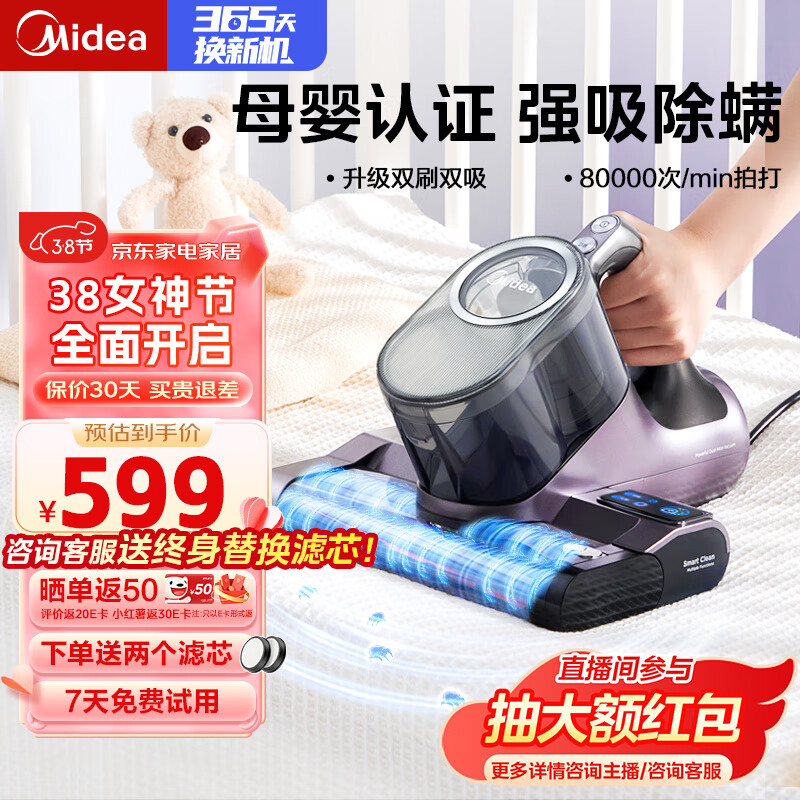 美的(Midea)【38好礼】除螨仪 双滚刷 双尘杯 家用床上吸尘器紫外线杀菌去螨虫超大吸力MC6价格:749.00元!