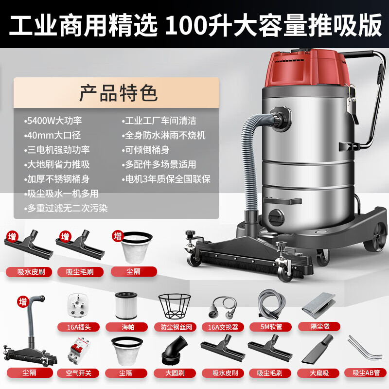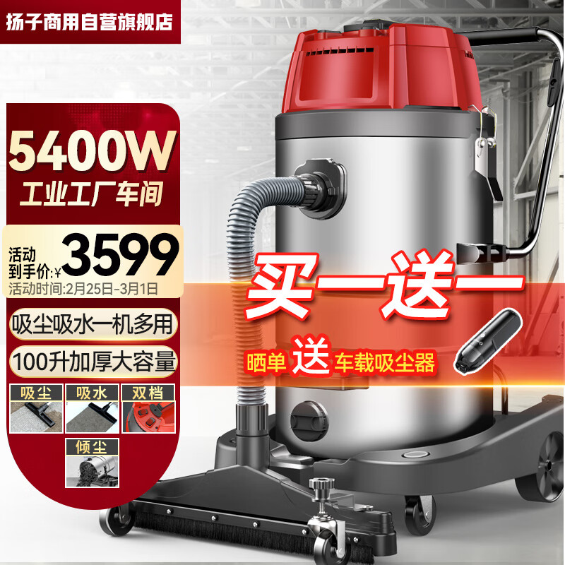 扬子(YANGZI)工业吸尘器5400W大功率干湿两用大吸力商用桶式吸尘机工厂车间厂房吸尘机 100L推吸价格:3799.00元!