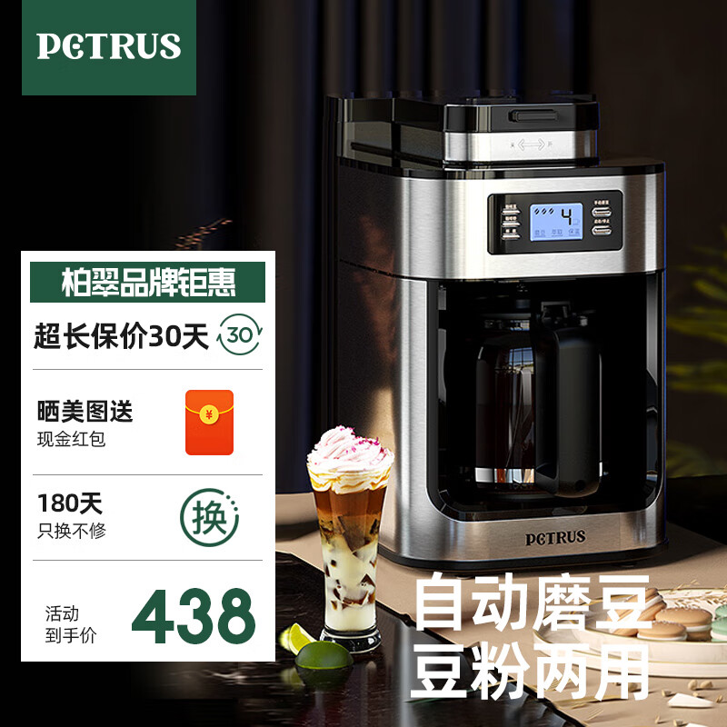 柏翠 (petrus) 咖啡机家用全自动美式滴漏式磨豆研磨一体机小型办公室煮咖啡壶PE3200价格:443.00元!