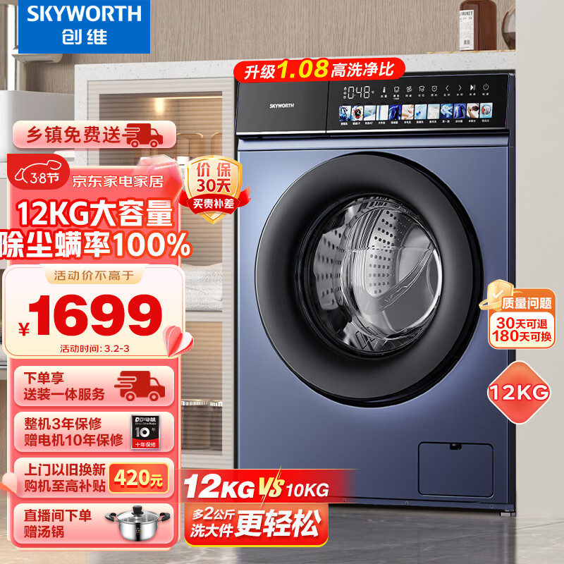创维(SKYWORTH)12KG公斤超薄大容量滚筒洗衣机全自动 一级变频低噪节能 除螨 晶彩大屏XQG120-B36GD价格:1699.00元!