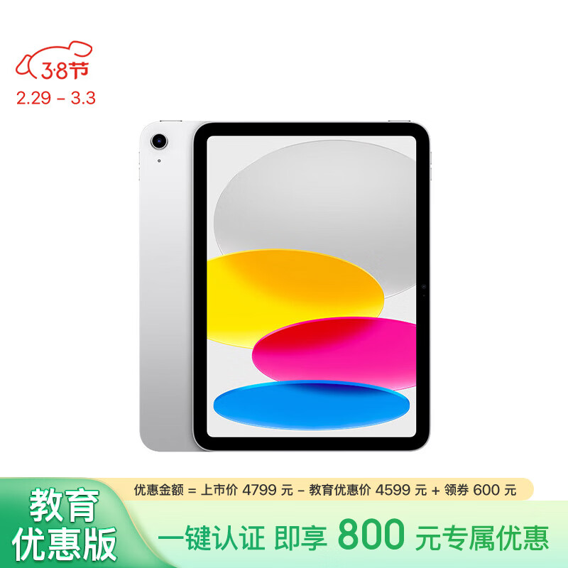 Apple/苹果【教育优惠】iPad 10.9英寸 2022款(256GB WLAN版/A14芯片/学习办公娱乐/MPQ83CH/A)银色价格:4599.00元!