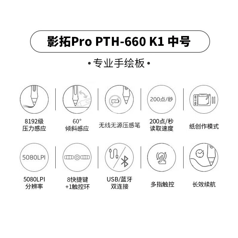 Wacom 和冠 影拓Pro 数位板 手绘板 电脑网课手写板 绘画板 写字板 绘图板 PTH-660/K1 双模加强版(中号)价格:2559.00元!