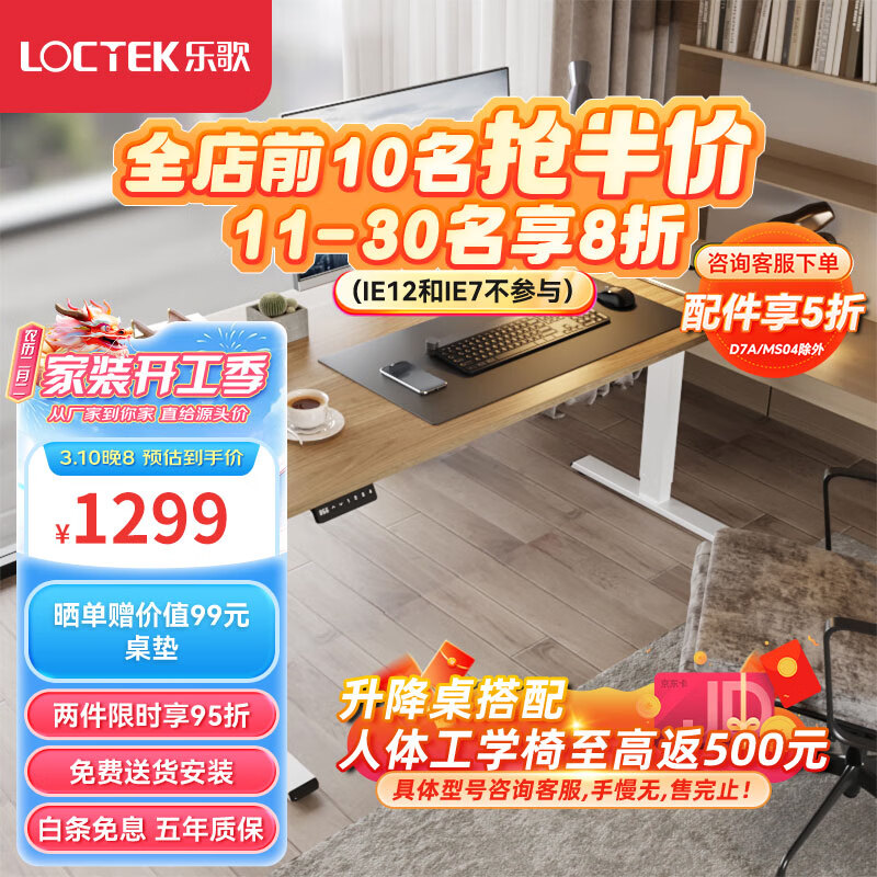 乐歌电动升降电脑桌站立式书桌家用台式写字桌青春派E2原木色1.6m桌价格:1299.00元!
