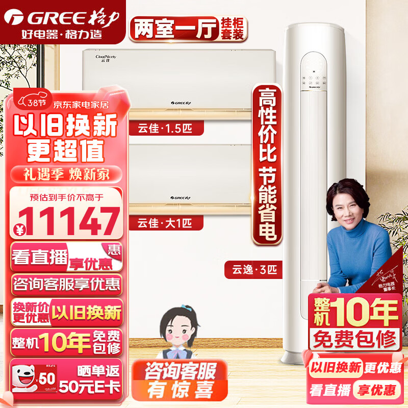 格力(GREE)空调 快速冷暖除湿新能效智能空调组合套装(1匹云佳三级挂机+1.5匹云佳三级挂机+3匹云逸三级柜机)价格:11147.00元!