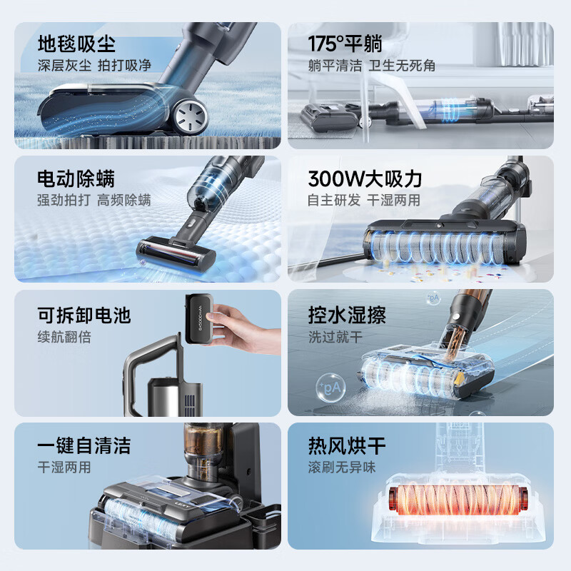特色功能:除菌,电池可拆卸,语音提示,垃圾干湿分离,毛发防缠绕,沿边清洁,烘干,吸水