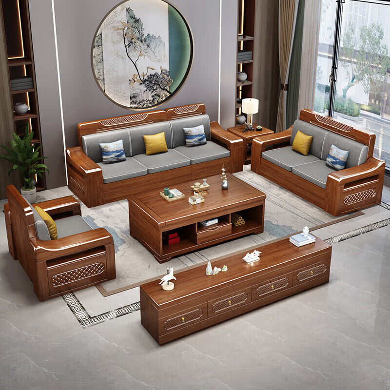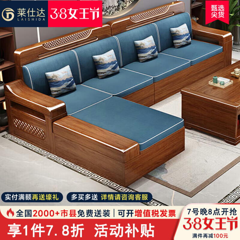 莱仕达胡桃木实木沙发组合大小户型新中式客厅储物家具XP916 三人+贵妃价格:3874.00元!