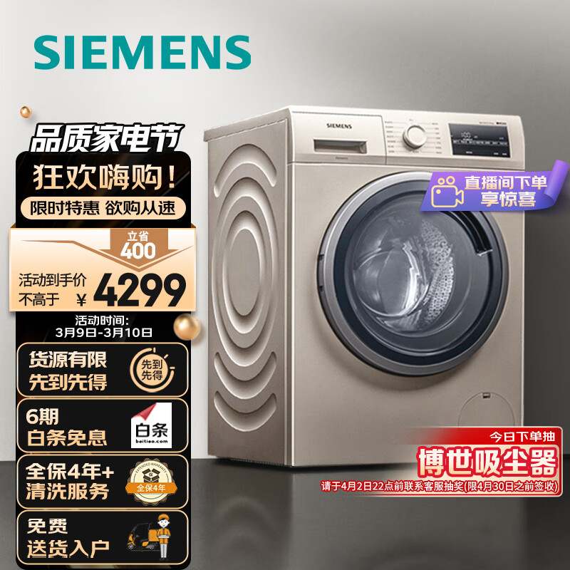 西门子(SIEMENS) 9公斤滚筒洗衣机洗烘一体机 99.99%除菌 专业羽绒洗 智能烘干 XQG90-WN42A1X31W价格:4699.00元!
