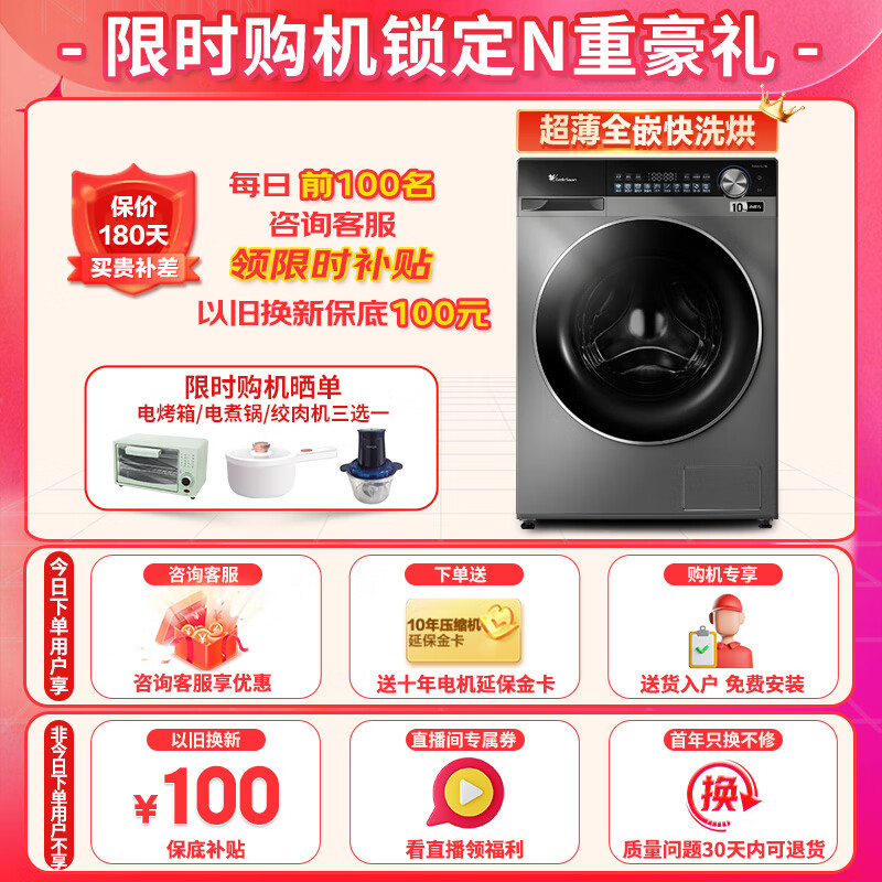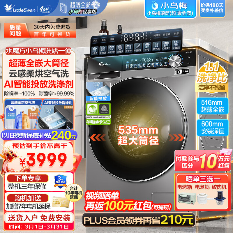 小天鹅(LittleSwan)10公斤水魔方滚筒洗衣机轻享版小乌梅超薄全嵌冷水洗智能投放大筒径羊毛绿标认证多效除菌洗衣机 水魔方超薄全嵌【洗烘一体】1.1洗净比SC18价格:3899.00元!