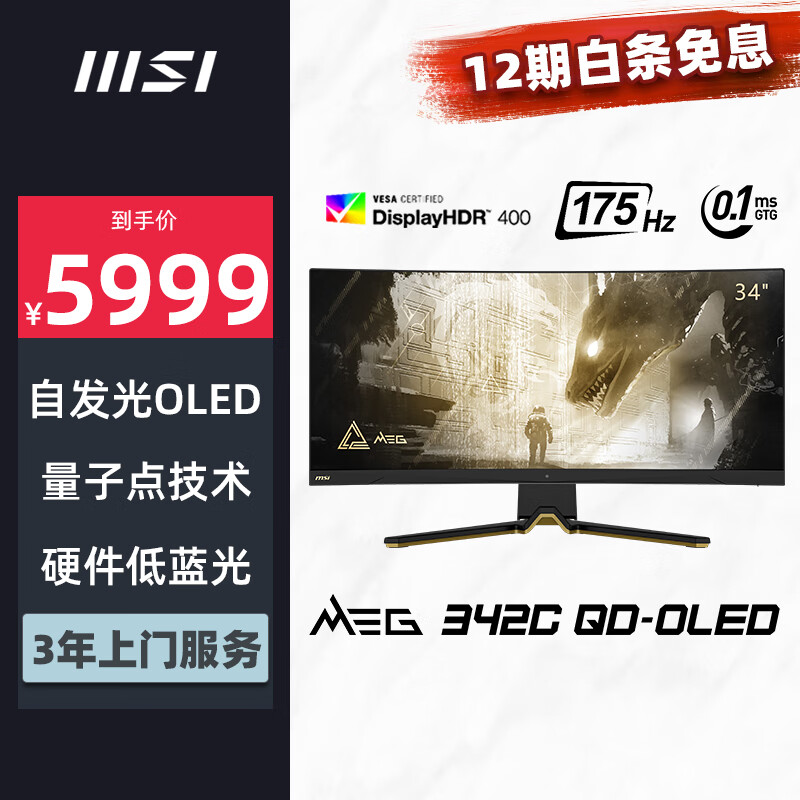 微星(MSI)34英寸 准4K 量子点 OLED 曲面屏 175Hz 0.1ms(GTG) 原生10Bit 电竞显示器 MEG 342C QD-OLED价格:7999.00元!