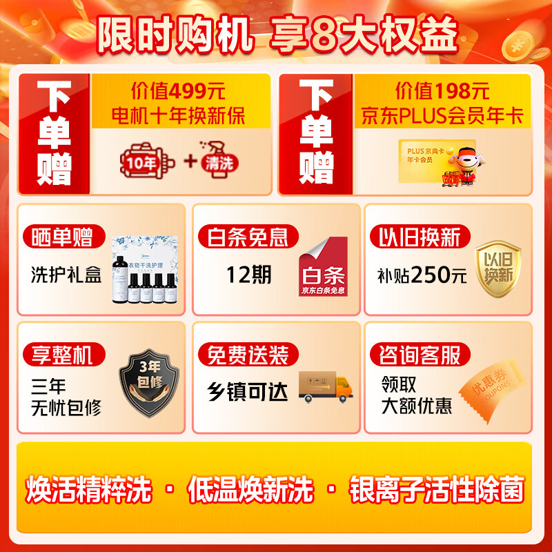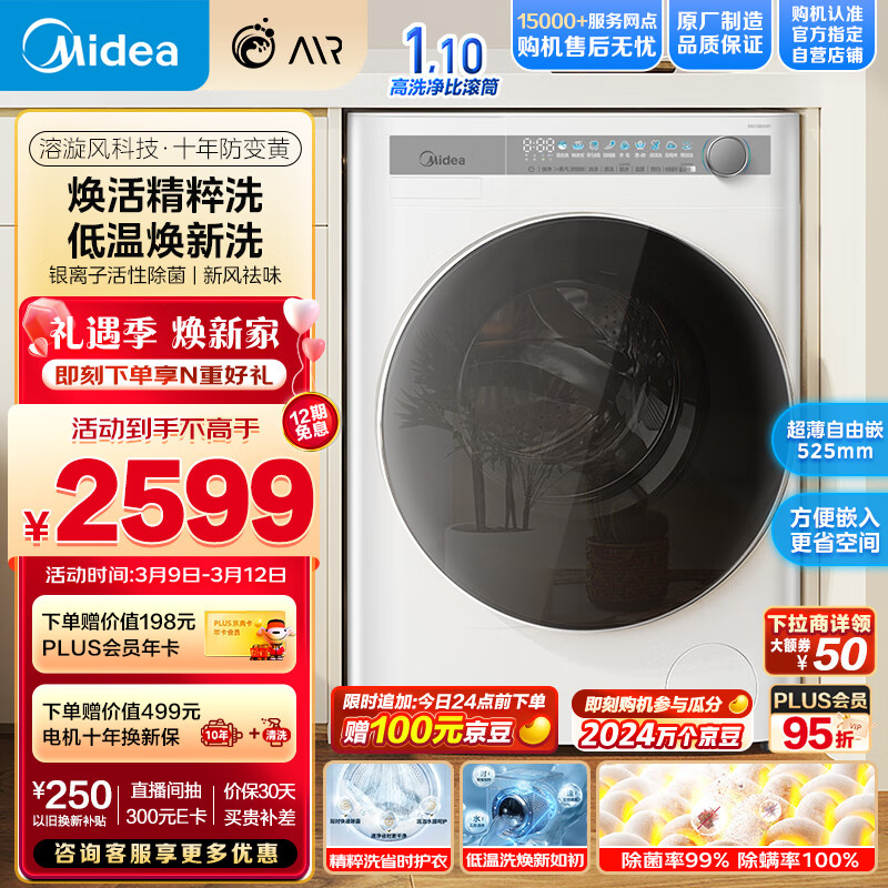 美的(Midea)滚筒洗衣机全自动 AIR系列 创新精粹洗 超薄自由嵌 10公斤 1.1洗净比 银离子活性除菌 MG100AIR1价格:2599.00元!