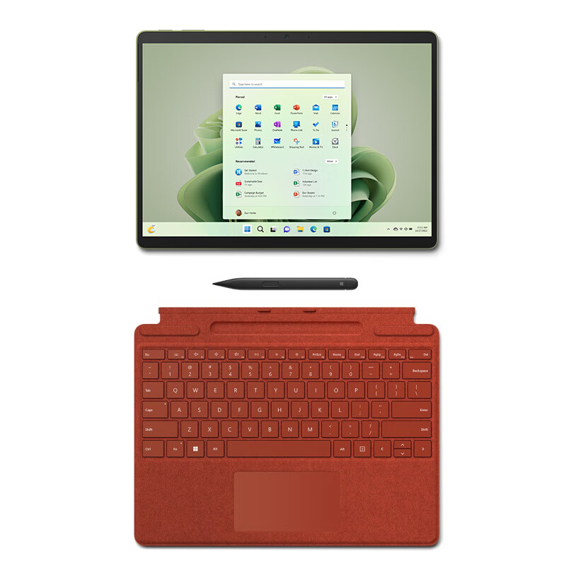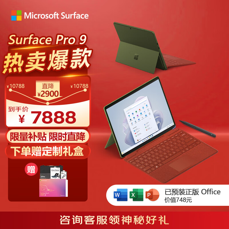 微软Surface Pro 9森野绿+波比红带触控笔键盘盖i5 8G+256G 二合一学生平板 13英寸120Hz屏 笔记本电脑价格:7888.00元!