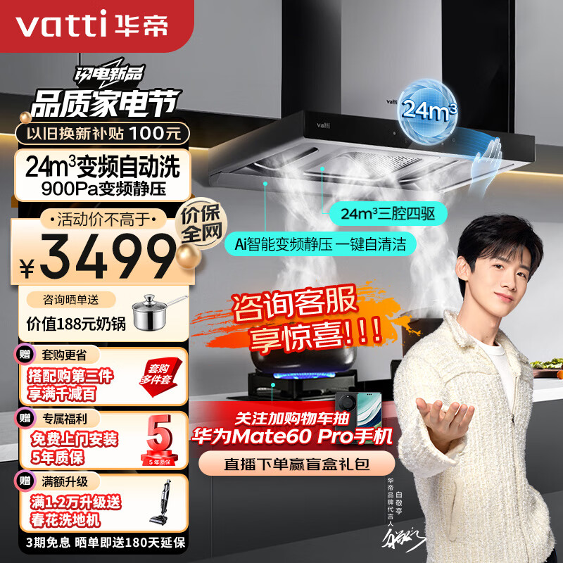 华帝(VATTI)抽油烟机家用顶侧欧式变频大吸力烟机燃气灶烟灶套装24风量自动清洗吸油烟机灶具套装i11206天然气价格:3499.00元!