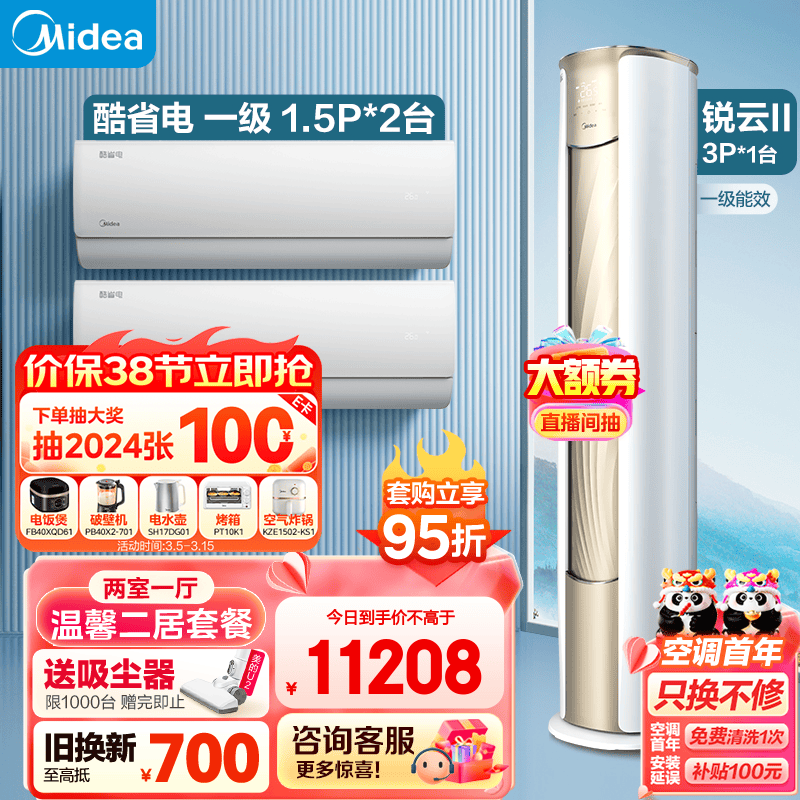 美的(Midea)温馨二居套餐 套购一站式 锐云2代空调套装 (1.5匹酷省电一级*2+3匹锐云)价格:11797.00元!