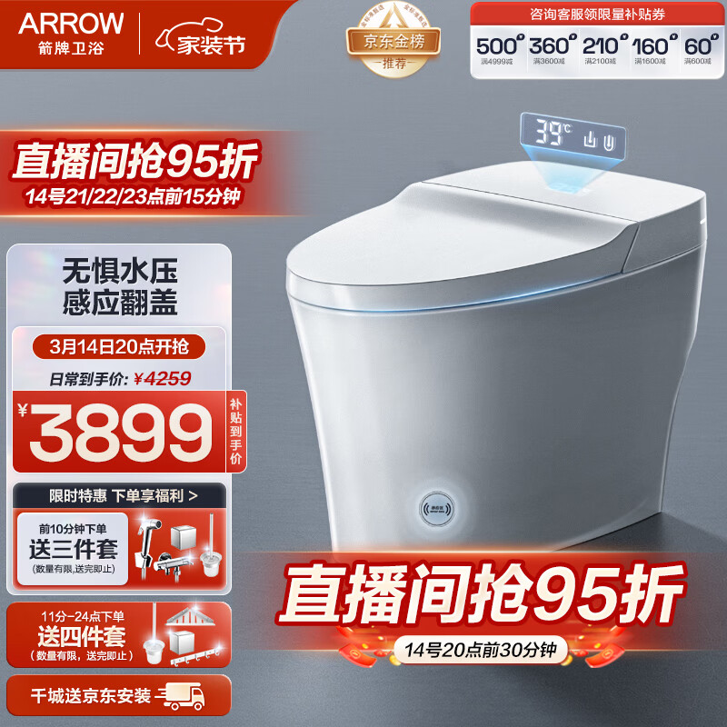 箭牌(ARROW)智能马桶恒温座圈按摩加热坐便器 低水压脚感翻盖翻圈AKE1135L价格:6255.00元!