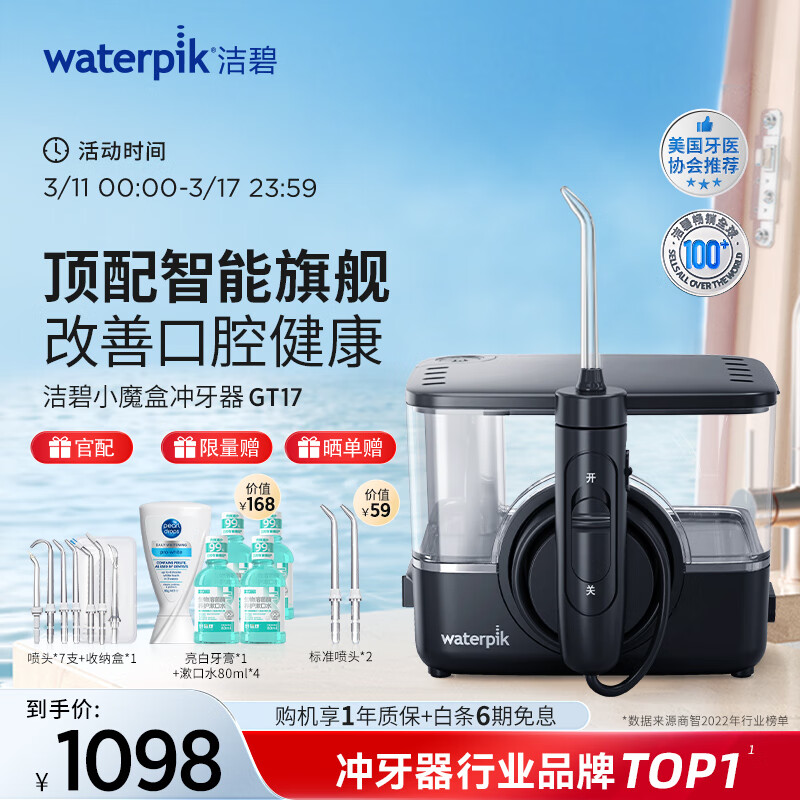 洁碧(Waterpik)冲牙器无线台式电动洗牙器水牙线洁牙器家用立式预防牙结石小魔盒 GT17-26价格:1098.00元!