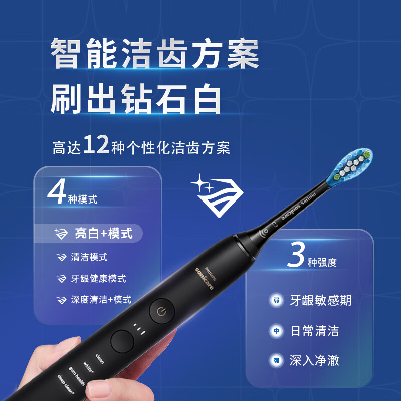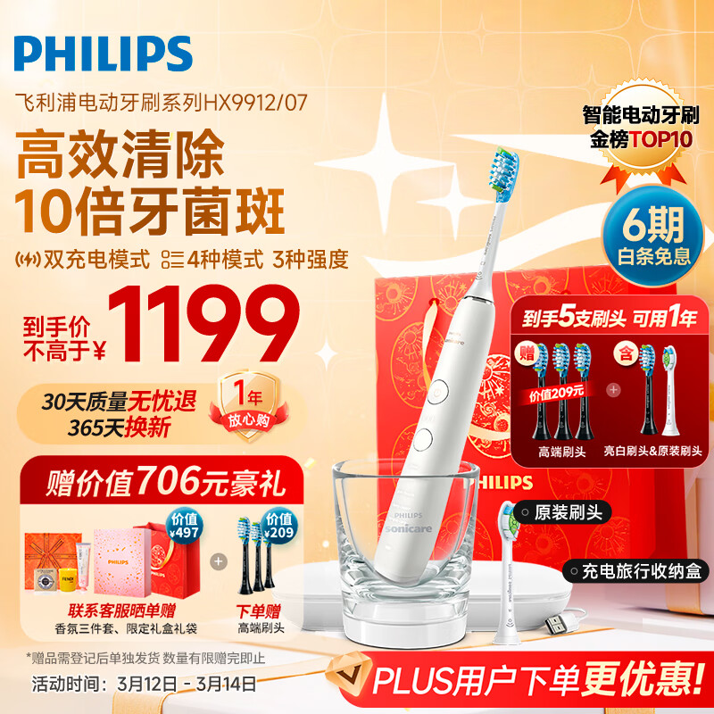 飞利浦(PHILIPS)智能声波震动电动牙刷情侣款 生日礼物送男友/女友 蓝牙APP含刷头+充电玻璃杯 钻石刷9系Pro 白色价格:1299.00元!