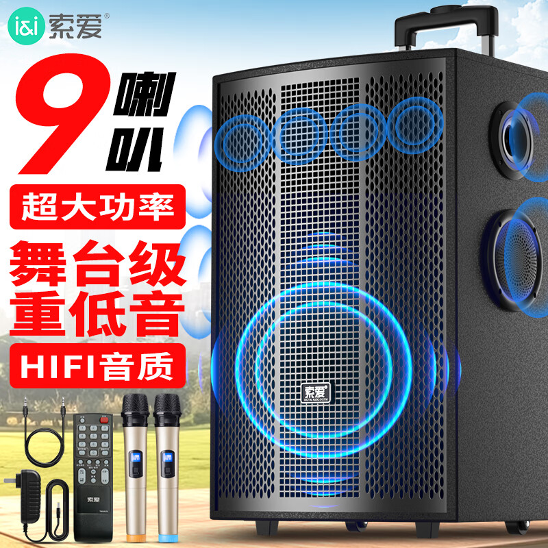 索爱(soaiy)SA-F85大功率9喇叭重低音广场舞音响移动家用户外K歌蓝牙拉杆便携式音箱扩音器带无线话筒8英寸价格:799.00元!