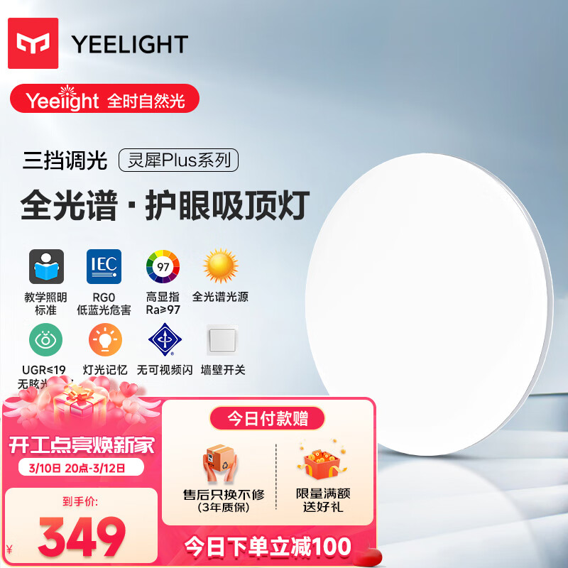 Yeelight易来灵犀Plus全光谱低蓝光护眼led吸顶灯客厅卧室超薄调光版 500价格:449.00元!