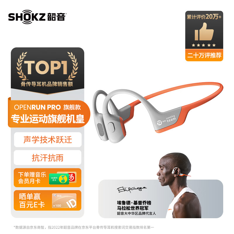 韶音(SHOKZ)OpenRun Pro骨传导蓝牙耳机开放式耳机运动无线耳骨传导耳机跑步骑行不入耳佩戴S810/S811 【基普乔格联名】EK橙价格:1298.00元!